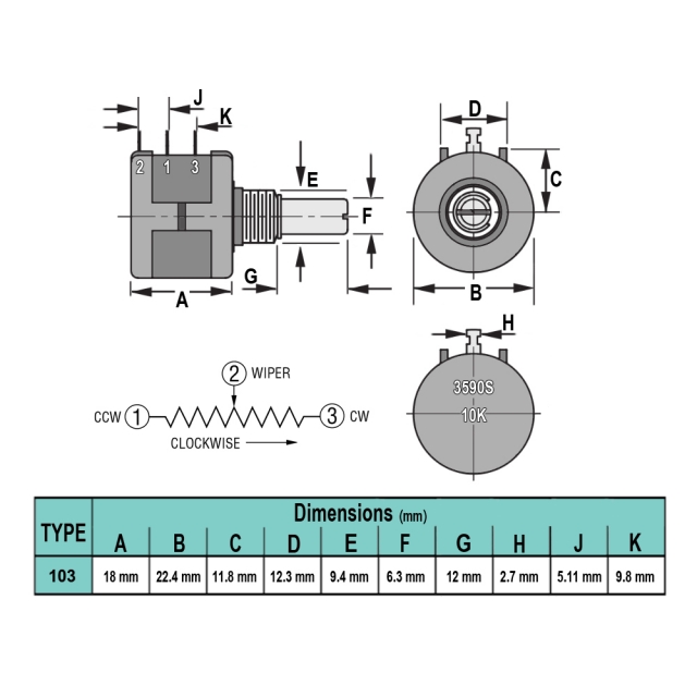 ولوم یا مقاومت متغیر سیمی خطی 10 دور 10KΩ مدل 3590S-2-103L برند بونز پایه لحیمی با تحمل توان 2 وات