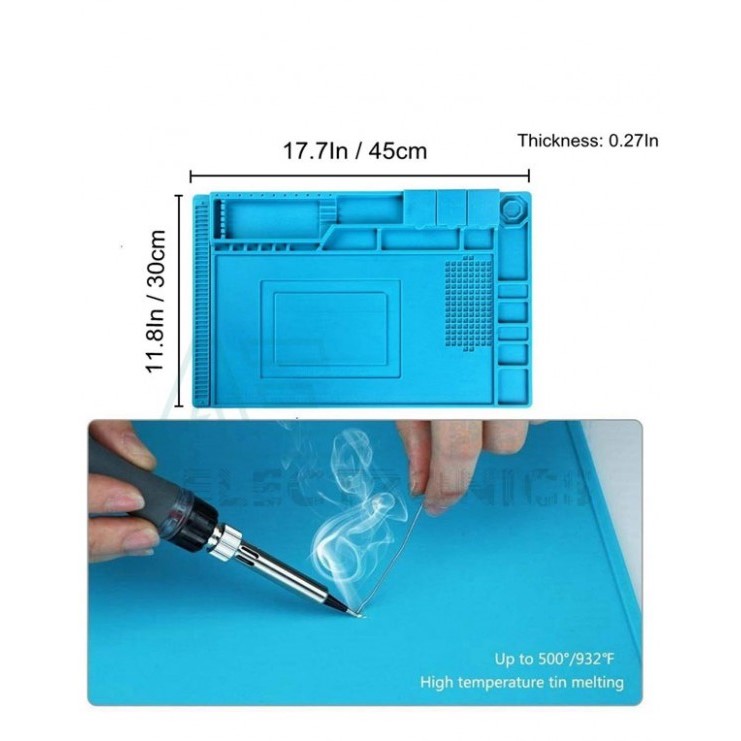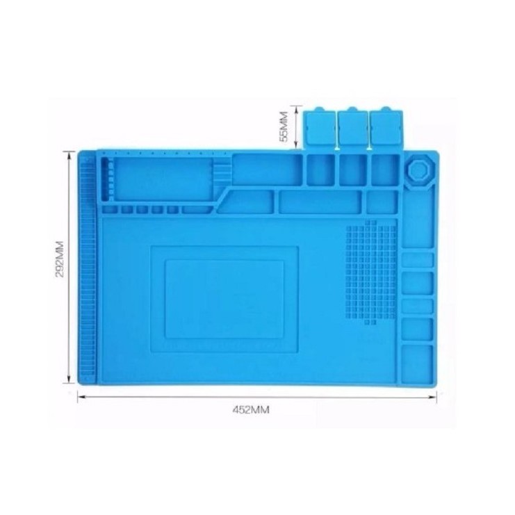 این صفحه مناسب برای کار مونتاژ و یا تعمیر موبایل و یا مونتاژ بردهای الکتریکی می باشد. جنس این صفحه از سیلیکون است و نسوز می باشد. دارای بخش های مختلف جهت نگهداری آی سی های SMD و دیپ، لوازم مونتاژ، صفحه ی برد PCB یا برد موبایل و … می باشد. همچنین دارای خط کش 30cm است.